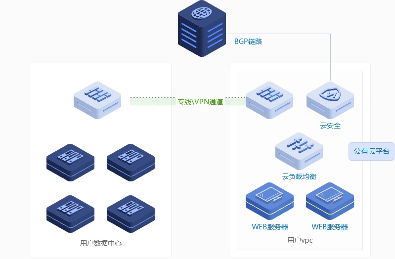 云通過專線、VPN等高速互聯(lián)方式,把云上的計(jì)算、存儲(chǔ)、網(wǎng)絡(luò)、安全等資源與企業(yè)原有的資源進(jìn) 行無縫整合,幫助企業(yè)安全、高效、低成本的快速發(fā)展。