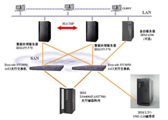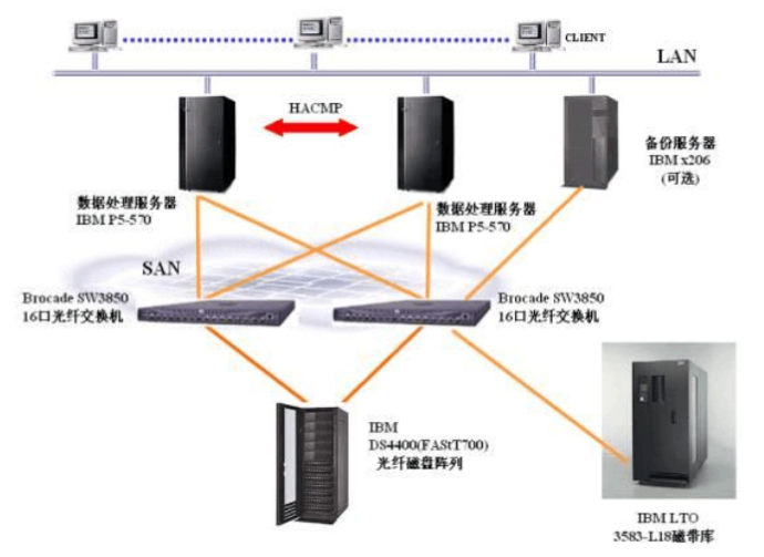 其次,使用高性能、大容量的IBMDS4400磁盤陣列,集中數(shù)據(jù)資源,保障可靠性,方便存儲系統(tǒng)的管理;