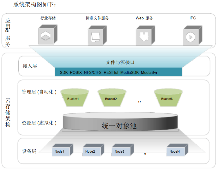 為確保整個(gè)系統(tǒng)能夠穩(wěn)定工作,軟件平臺(tái)將使用先進(jìn)、完善、易于管理和穩(wěn)定可靠的云存儲(chǔ)資源管理系統(tǒng),對(duì)于與應(yīng)用的集成接口,提供高效穩(wěn)定統(tǒng)一的訪問接口。