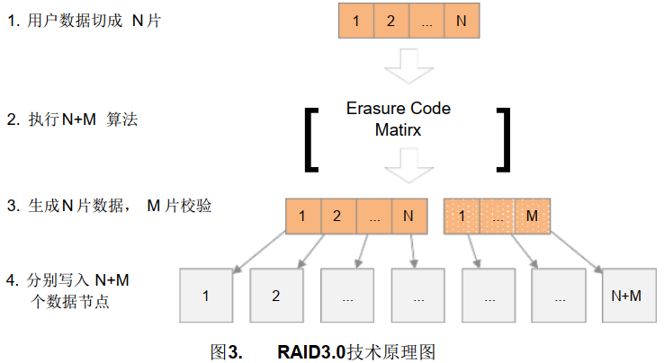 RAID3.0技術(shù)將用戶輸入的一個(gè)文件或?qū)ο?,切分?span>N塊數(shù)據(jù),通過Erasure Coding技術(shù)計(jì)算得到冗余的M塊數(shù)據(jù),將N+M塊數(shù)據(jù)分散分布到N+M個(gè)網(wǎng)絡(luò)數(shù)據(jù)節(jié)點(diǎn)上,從而提供容忍M個(gè)分布在不同數(shù)據(jù)節(jié)點(diǎn)磁盤或節(jié)點(diǎn)級(jí)別故障能力。
