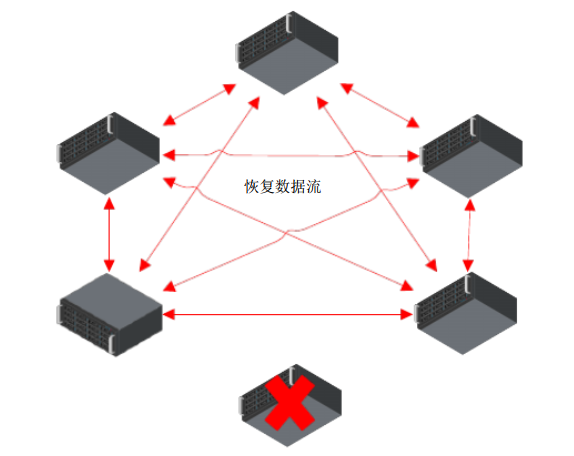 對(duì)于節(jié)點(diǎn)服務(wù)器,采用ErasureCode冗余方式實(shí)現(xiàn)容錯(cuò),數(shù)據(jù)冗余分布存儲(chǔ)在不同的數(shù)據(jù)節(jié)點(diǎn)上。任一數(shù)據(jù)節(jié)點(diǎn)的損壞,不會(huì)導(dǎo)致任何數(shù)據(jù)丟失,不會(huì)影響任何的數(shù)據(jù)訪問和寫入過程。之后,通過靈活數(shù)據(jù)恢復(fù)機(jī)制,進(jìn)行數(shù)據(jù)重建過程。