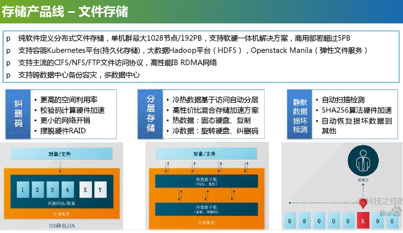 元數(shù)據(jù)服務(wù)器采用主備雙機(jī)熱備技術(shù),主機(jī)故障,備機(jī)自動(dòng)接替其工作,對(duì)外服務(wù)不停止;存儲(chǔ)節(jié)點(diǎn)采用Erasurecode冗余備份機(jī)制,如采用4+1節(jié)點(diǎn)間冗余容錯(cuò),任意損失一個(gè)節(jié)點(diǎn),數(shù)據(jù)不丟失,服務(wù)不停止,客戶端無感知。