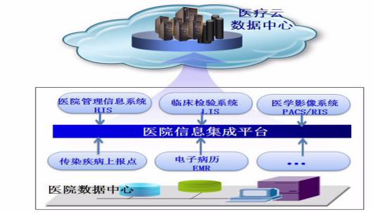 比如非常著名的醫(yī)療云:醫(yī)院的HIS系統(tǒng)通過網(wǎng)絡(luò)連接到衛(wèi)生部門的數(shù)據(jù)中心。