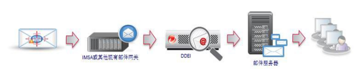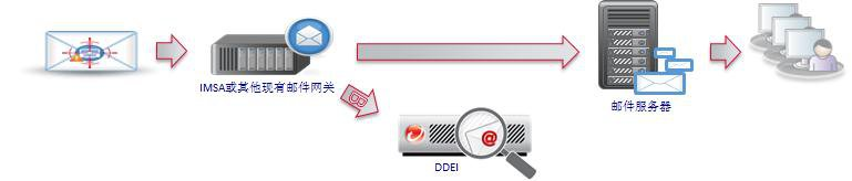 DDEI被串聯(lián)接入,接收來自上游MTA(通常為AV/SPAM郵件網(wǎng)關(guān))發(fā)送的郵件,再分發(fā)給下游MTA。