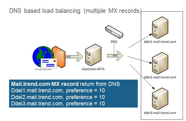 該方案的原理是,當(dāng)DDEI服務(wù)器被查詢時(shí),DNS服務(wù)器返回多個(gè)DDEI服務(wù)器的IP地址。一個(gè)方法是使用多條MX記錄,一條記錄對(duì)應(yīng)一臺(tái)DDEI設(shè)備。如果這些記錄具有相同的優(yōu)先級(jí),那么SMTP代理會(huì)從中隨機(jī)選擇一條記錄,并將郵件交給這條記錄對(duì)應(yīng)的DDEI設(shè)備處理,也就是所謂的A-A模式;如果優(yōu)先級(jí)不同,SMTP代理會(huì)選擇優(yōu)先級(jí)高的記錄,如果該記錄所對(duì)應(yīng)的DDEI設(shè)備目前處于工作狀態(tài),SMTP代理會(huì)將郵件分發(fā)給該DDEI設(shè)備處理,如果該設(shè)備處于非工作狀態(tài)(宕機(jī),失去網(wǎng)絡(luò)連接等),SMTP代理會(huì)選擇處于次優(yōu)先級(jí)的設(shè)備,然后將郵件分發(fā)給其進(jìn)行處理,也就是所謂的A-B模式。
