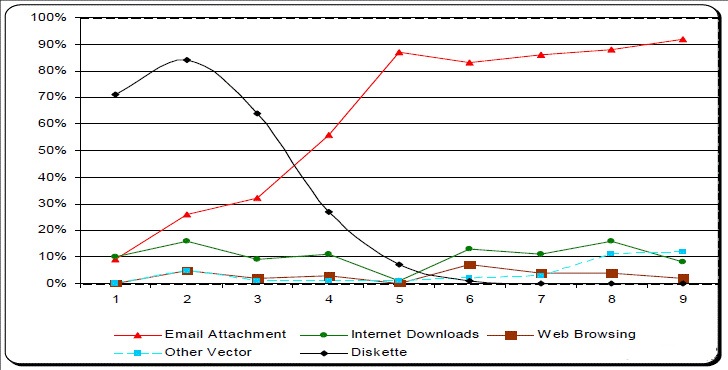 計算機病毒一直是信息安全的主要威脅。而隨著網(wǎng)絡(luò)的不斷發(fā)展,網(wǎng)絡(luò)速度越來越快,網(wǎng)絡(luò)應(yīng)用也越來越豐富多彩,使得病毒傳播的風(fēng)險也越來越大,造成的破壞也越來越強。據(jù)ICSA(國際計算機安全協(xié)會)的統(tǒng)計,目前已經(jīng)有超過90%的病毒是通過網(wǎng)絡(luò)進(jìn)行傳播的。內(nèi)網(wǎng)用戶訪問Internet時,無論是瀏覽WEB頁面,還是通過FTP下載文件,或者是收發(fā)E-mail,甚至MSN聊天等,都可能將Internet上的病毒帶入網(wǎng)內(nèi)。而近幾年泛濫成災(zāi)的網(wǎng)絡(luò)蠕蟲病毒(如紅色代碼、尼姆達(dá)、沖擊波、振蕩波等)跟傳統(tǒng)的通過光盤、軟盤等介質(zhì)進(jìn)行傳播的基于文件的病毒有很大的不同,它們本身是一個病毒與黑客工具的結(jié)合體,當(dāng)網(wǎng)絡(luò)當(dāng)中一臺計算機感染蠕蟲病毒后,它會自動的以極快的速度(每秒幾百個線程)掃描網(wǎng)絡(luò)當(dāng)中其他計算機的安全漏洞,并主動的將病毒傳播到那些存在安全漏洞的計算機上,只要相關(guān)的安全漏洞沒有通過安裝補丁的方式加以彌補,蠕蟲病毒就會這樣以幾何級數(shù)的增長速度在網(wǎng)絡(luò)當(dāng)中傳播,即使計算機上安裝了帶有實時監(jiān)控功能的防病毒軟件(包括單機版和網(wǎng)絡(luò)版)對此也無能為力。蠕蟲病毒的傳播還會大量占用網(wǎng)絡(luò)帶寬,造成網(wǎng)絡(luò)擁堵,形成拒絕服務(wù)式攻擊(DoS)。