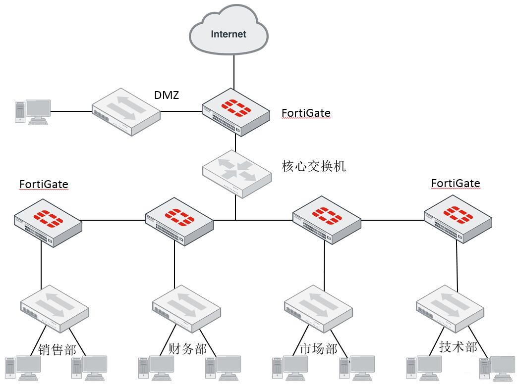 如前圖所示,除了在Internet出口處部署FortiGate之外,還可以在內(nèi)網(wǎng)各區(qū)域(如下屬單位、部門等)之間使用FortiGate進(jìn)行隔離,防止一個區(qū)域感染的病毒擴散到其它區(qū)域。