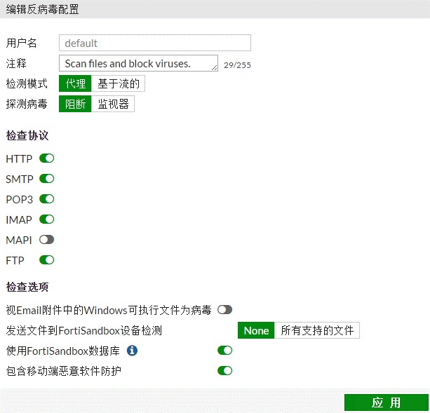 FortiGate支持基本病毒庫和擴展病毒庫,用戶可以針對不同協(xié)議開啟不同級別的安全保護(hù),在安全和性能之間進(jìn)行良好的平衡。