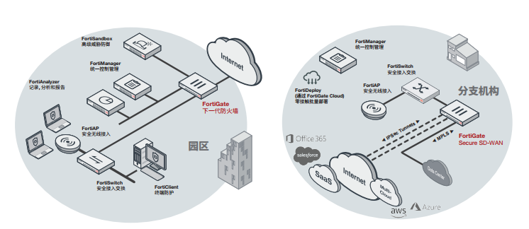 FortiGate在園區(qū)網(wǎng)絡(luò)中的部署(NGFW)FortiGate部署在分支機構(gòu)中(安全SD-WAN)
