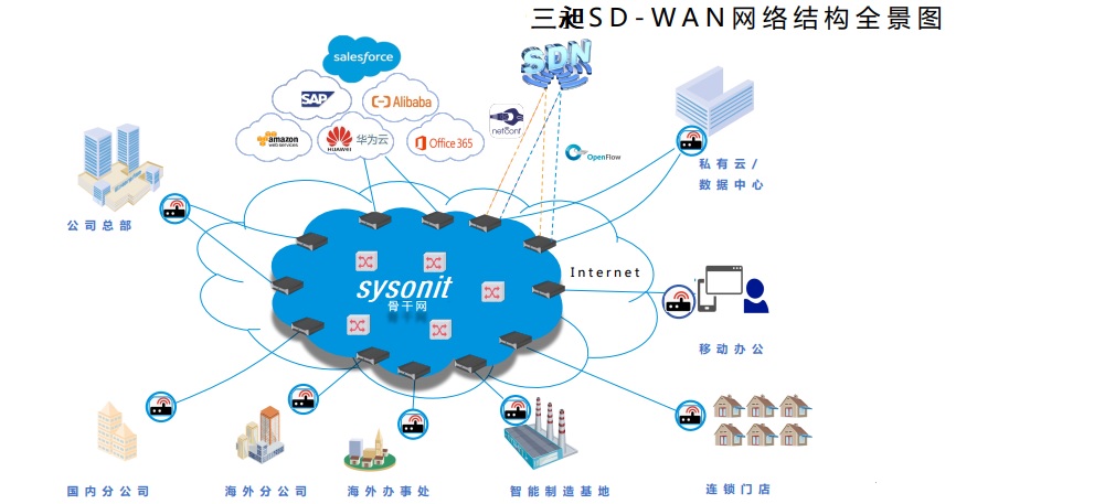 SD-WAN即軟件定義的廣域網(wǎng)。SDN-WAN是SDN的特定應(yīng)用,應(yīng)用于WAN,用于連接企業(yè)網(wǎng)絡(luò),包括分支機(jī)構(gòu)、數(shù)據(jù)中心和云,實(shí)現(xiàn)廣域網(wǎng)的最大范圍覆蓋。