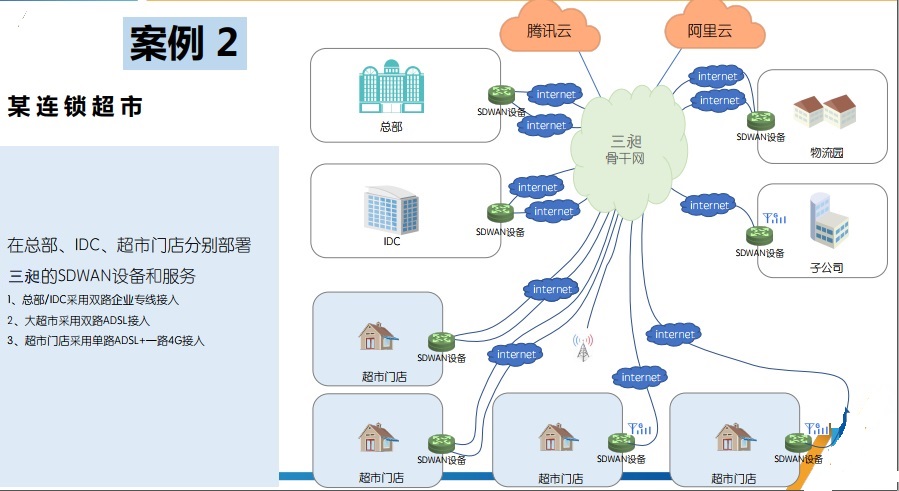 第一類就是前面介紹的SD-WAN。這里再說(shuō)一說(shuō)第二類,以三昶為例,三昶通過(guò)與各個(gè)SP合作,自己構(gòu)建了一個(gè)全球范圍的WAN。三昶的WAN在全球有400個(gè)接入點(diǎn)。據(jù)稱,對(duì)于世界上95%的企業(yè)來(lái)說(shuō),都可以找到小于30毫秒的延時(shí)的接入點(diǎn)。企業(yè)用戶需要通過(guò)Internet接入到三昶的接入點(diǎn),之后數(shù)據(jù)就跑在三昶的骨干網(wǎng)上。三昶相當(dāng)于對(duì)WAN做了虛擬化,在這之上虛擬出了多個(gè)私有WAN,供用戶使用。三昶的SD-WAN設(shè)備用來(lái)連接用戶網(wǎng)絡(luò)和其接入點(diǎn)。這種方式,部署簡(jiǎn)單,傳統(tǒng)的MPLS部署可能需要幾個(gè)月,而現(xiàn)在幾個(gè)小時(shí)就可以了。成本上也能大大降低,三昶的產(chǎn)品比較同等的MPLS,節(jié)約了超過(guò)50%的成本。下圖是三昶的組網(wǎng)示意圖。