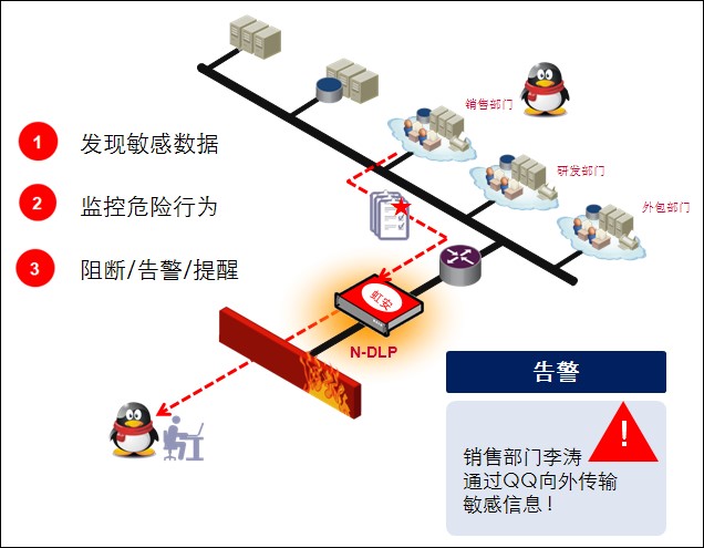 N-DLP系統(tǒng)對網(wǎng)絡(luò)中的敏感數(shù)據(jù)進(jìn)行內(nèi)容識別、威脅監(jiān)控與安全防護(hù)(阻斷、提醒、告警、加密等),實(shí)現(xiàn)網(wǎng)絡(luò)中敏感數(shù)據(jù)泄露防護(hù);