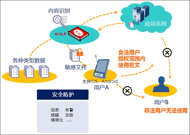 M-DLP系統(tǒng)對應(yīng)用系統(tǒng)以及智能移動終端(支持IOS、Android)中敏感數(shù)據(jù)進(jìn)行內(nèi)容識別、威脅監(jiān)控與安全防護(hù)(阻斷、提醒、告警、加密、模糊化...),實(shí)現(xiàn)數(shù)據(jù)泄露、擴(kuò)散防護(hù);