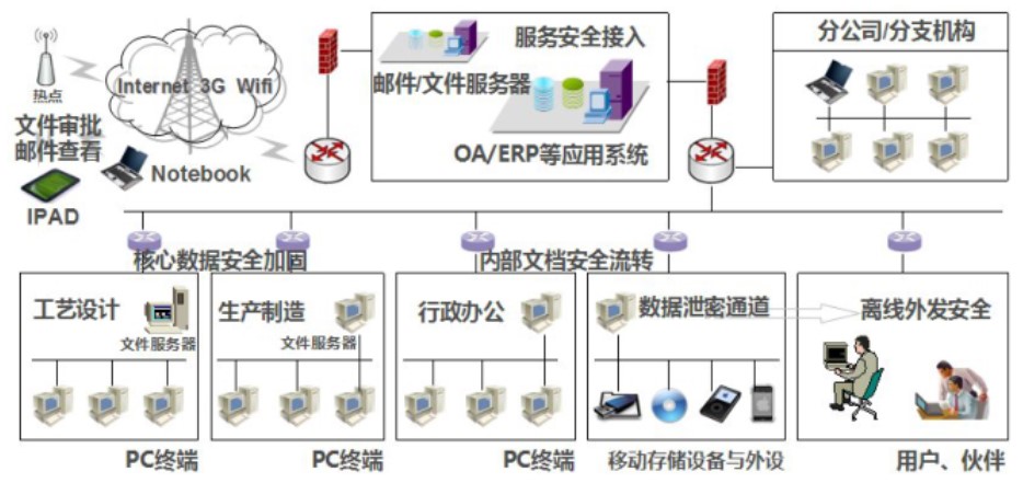 根據(jù)企業(yè)信息化的業(yè)務(wù)應(yīng)用需求,企業(yè)每個員工的業(yè)務(wù)操作方式主要集中在終端之上,但也會從OA應(yīng)用系統(tǒng)、文件服務(wù)器或者郵件系統(tǒng)等應(yīng)用服務(wù)系統(tǒng)中瀏覽數(shù)據(jù)或者下載文檔,存在如下主要幾個方面的數(shù)據(jù)安全隱患以及操作體驗(yàn)要求,如下圖所示。