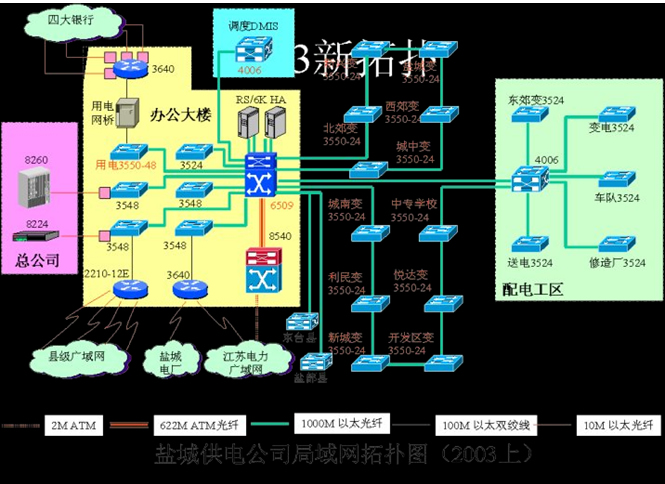 廣域網(wǎng)接入交換機:采用Cisco8540MSR,采用155MATM接口通過三級網(wǎng)接入江蘇電力企業(yè)內(nèi)聯(lián)網(wǎng),通過622MATM接口連接核心交換機6509。